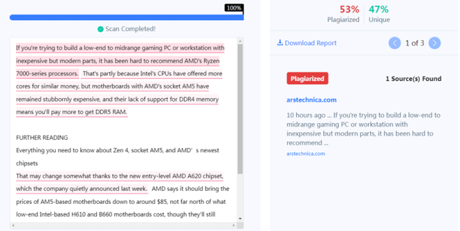 CopyScape is an AI plagiarism detector that scans entire web pages. Users can simply copy and paste the URL of a web page into CopyScape, and within a minute or two, they can get the URLs that may have copied the content of that web page, and also calculate the percentage of plagiarized content in the full text.